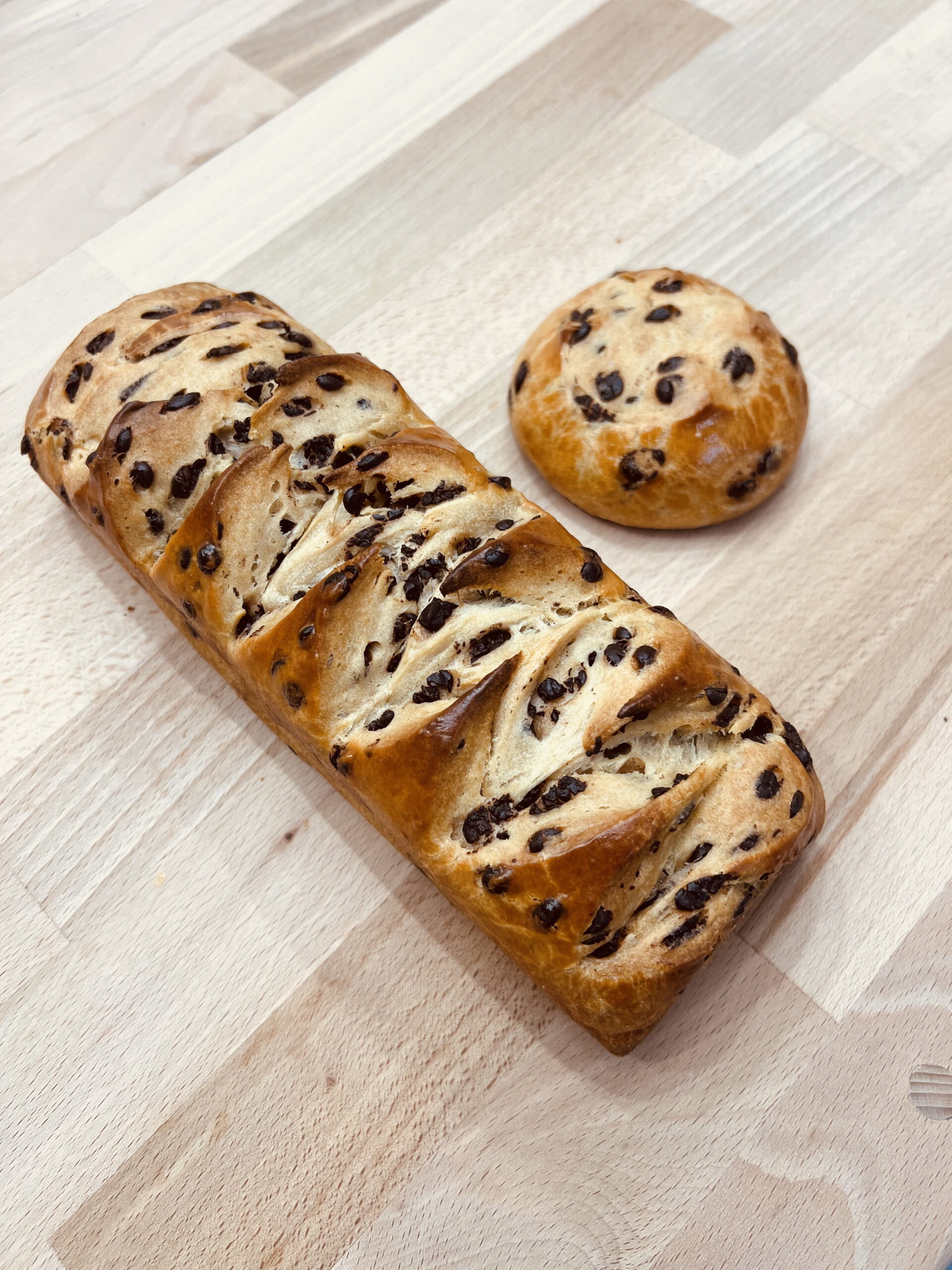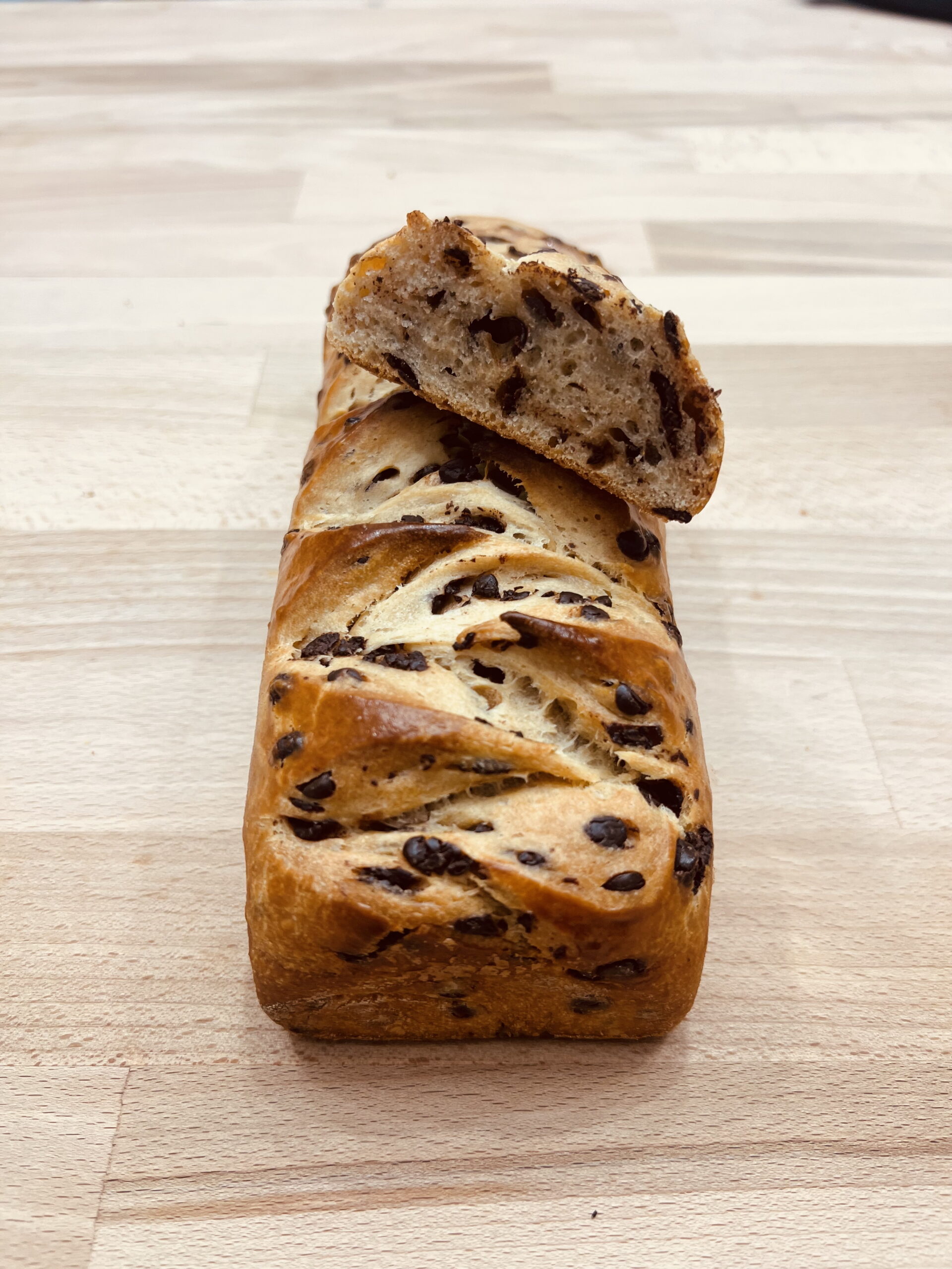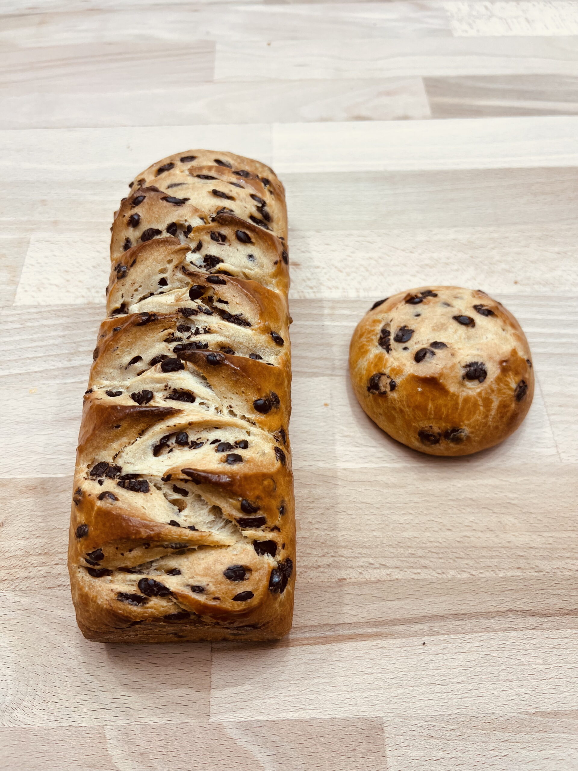Brioche fabriquée à partir de farine de blé semi-complète T80, Oeufs Bio, Beurre de barrate français Bio, Sucre de betterave français Bio et pépites de chocolat 60%. Brioche au levain cuite au four à bois. Disponible en 80gr ou 500gr.