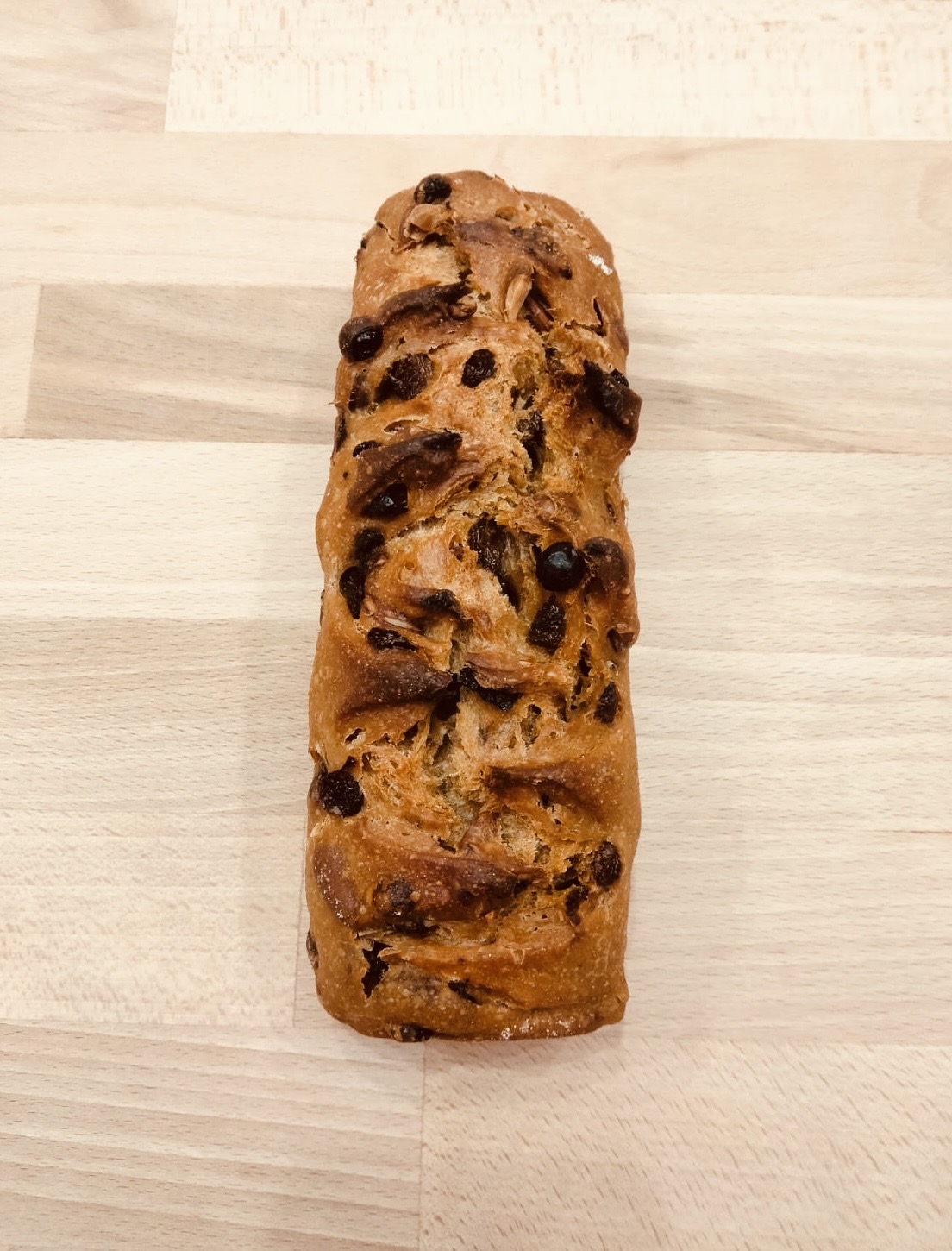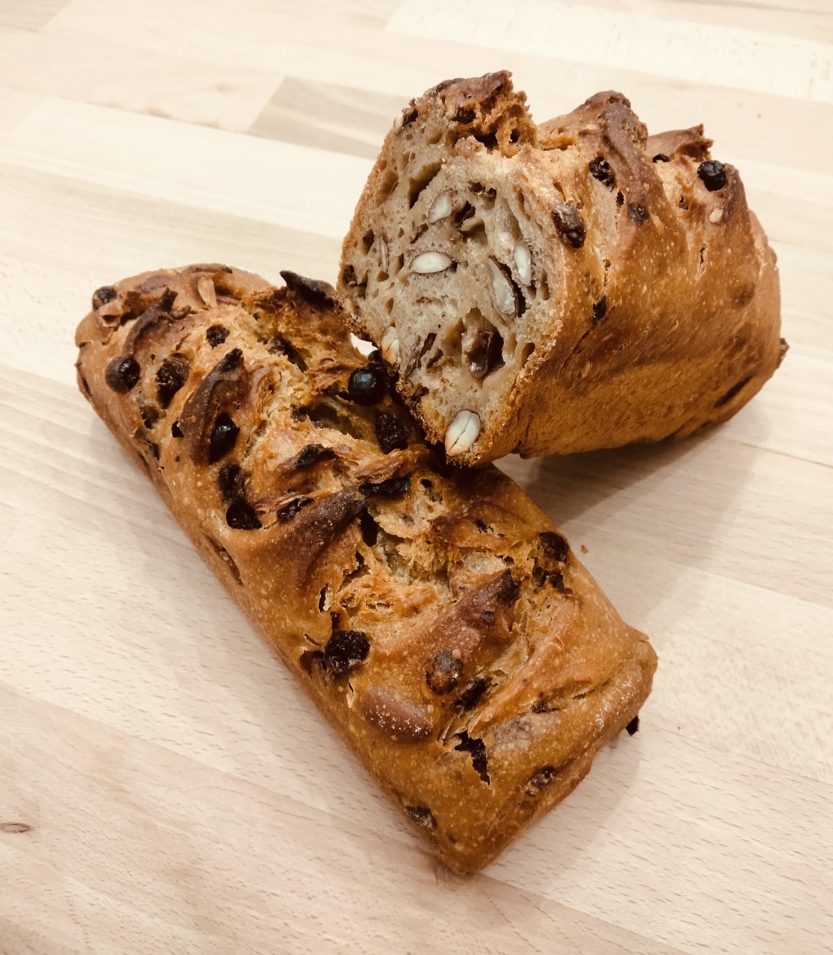 Pain à la farine de blé semi-complète T80 avec des amandes, des noisettes et du raisin. Pain Bio au levain cuit au feu de bois. Disponible en 500gr.