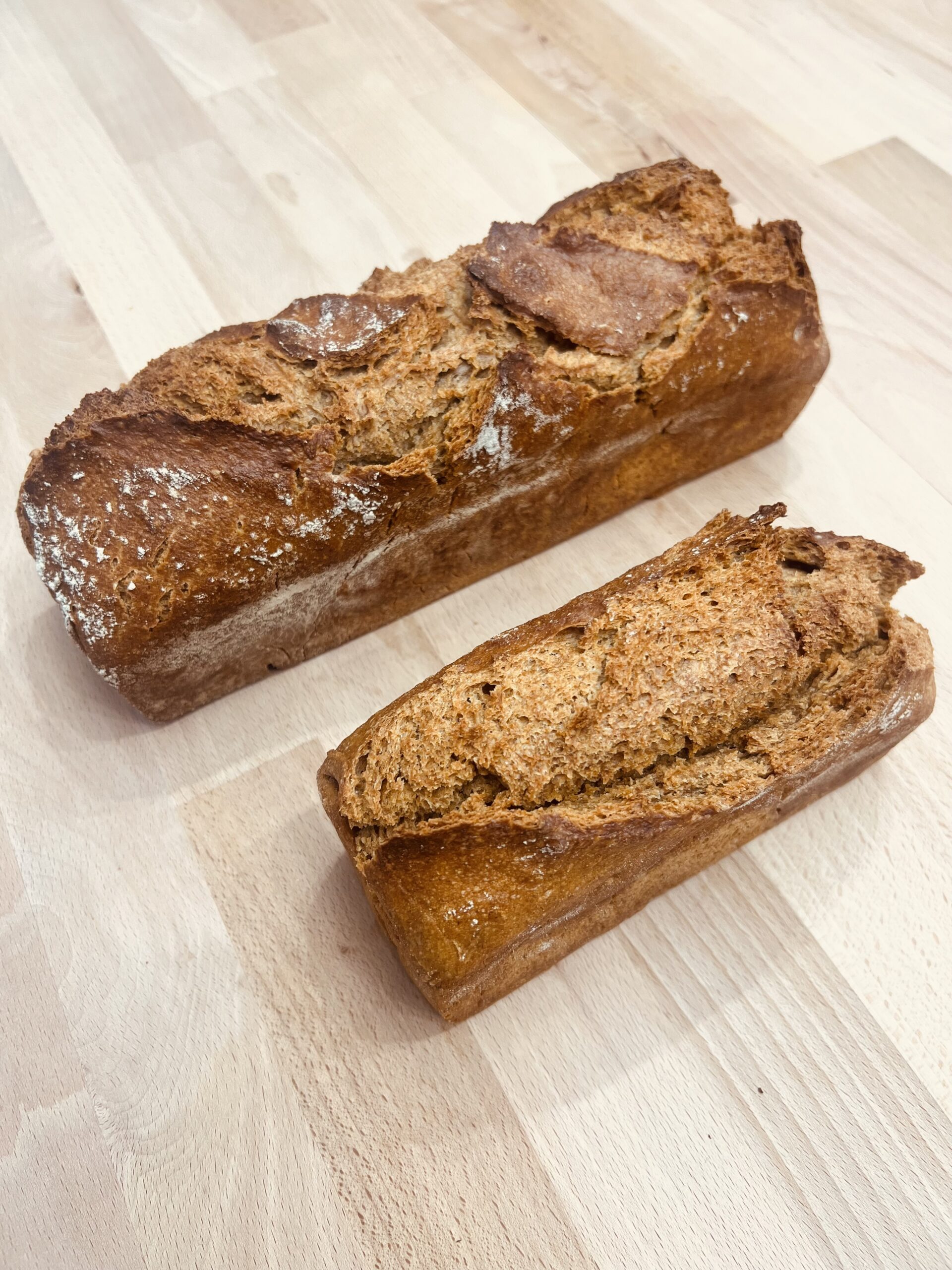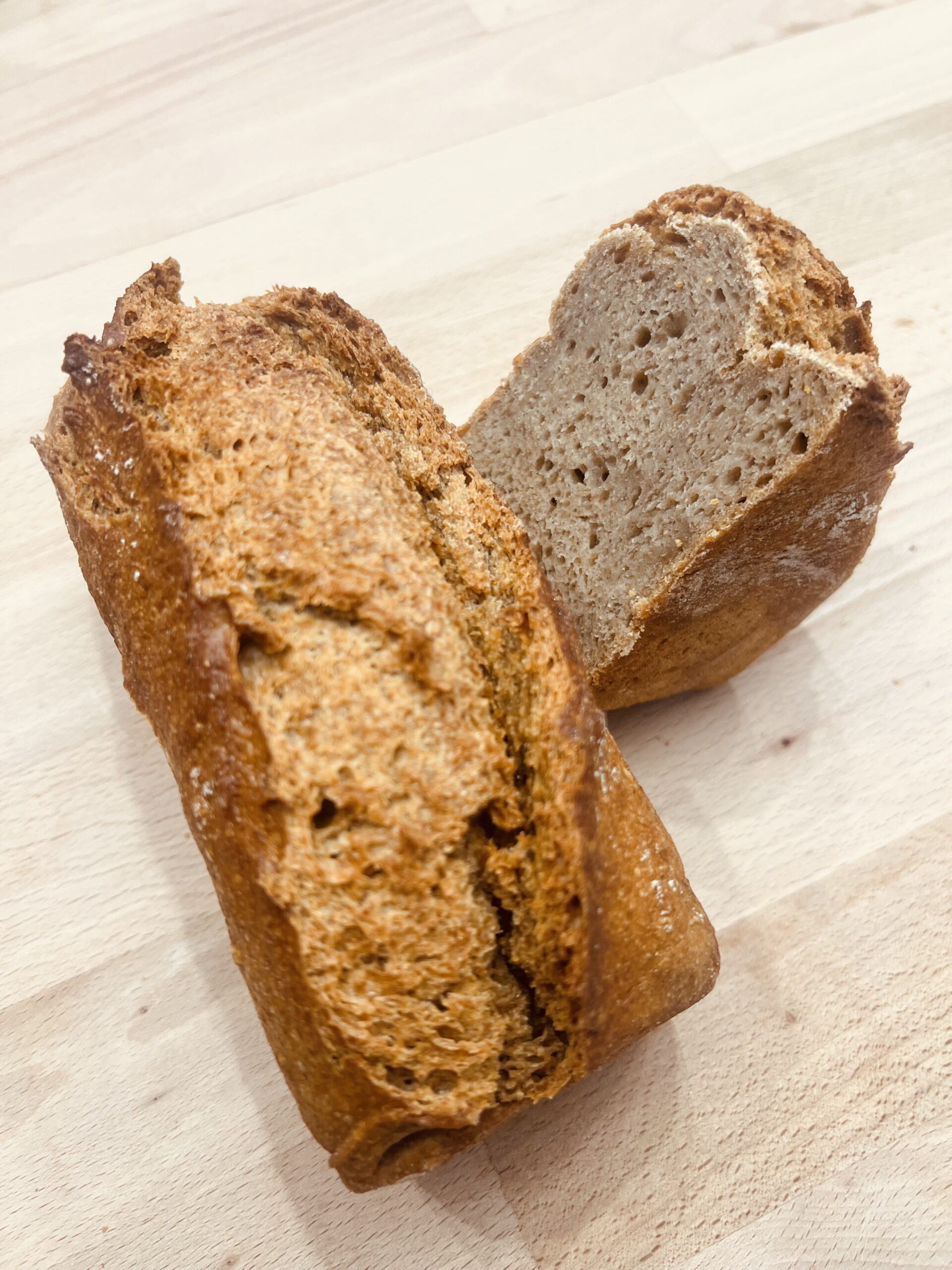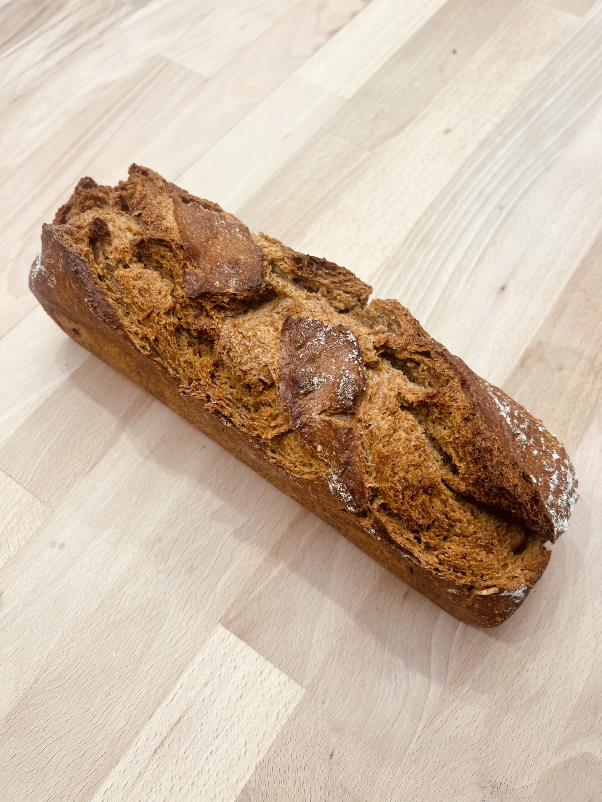 Pain de Méteil produit avec 50% de farine de blé semi complète T80 et 50% de farine de seigle complète T170. Pain au levain cuit au four à bois. Disponible en 500gr et en 1kg.